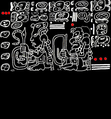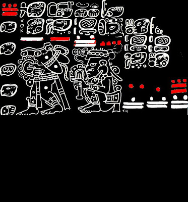 En la parte superior se observa vagamente un rostro humano que lleva la lengua colgando fuera de la boca, se trata de una cabeza muy ornamentada con un pectoral perlado de cascabeles que representa a la deidad celeste, mientras que en la parte inferior de esta misma página, hay un par de imágenes, la de la izquierda parece representar a uno de dioses solares y la de la derecha queda irreconocible.